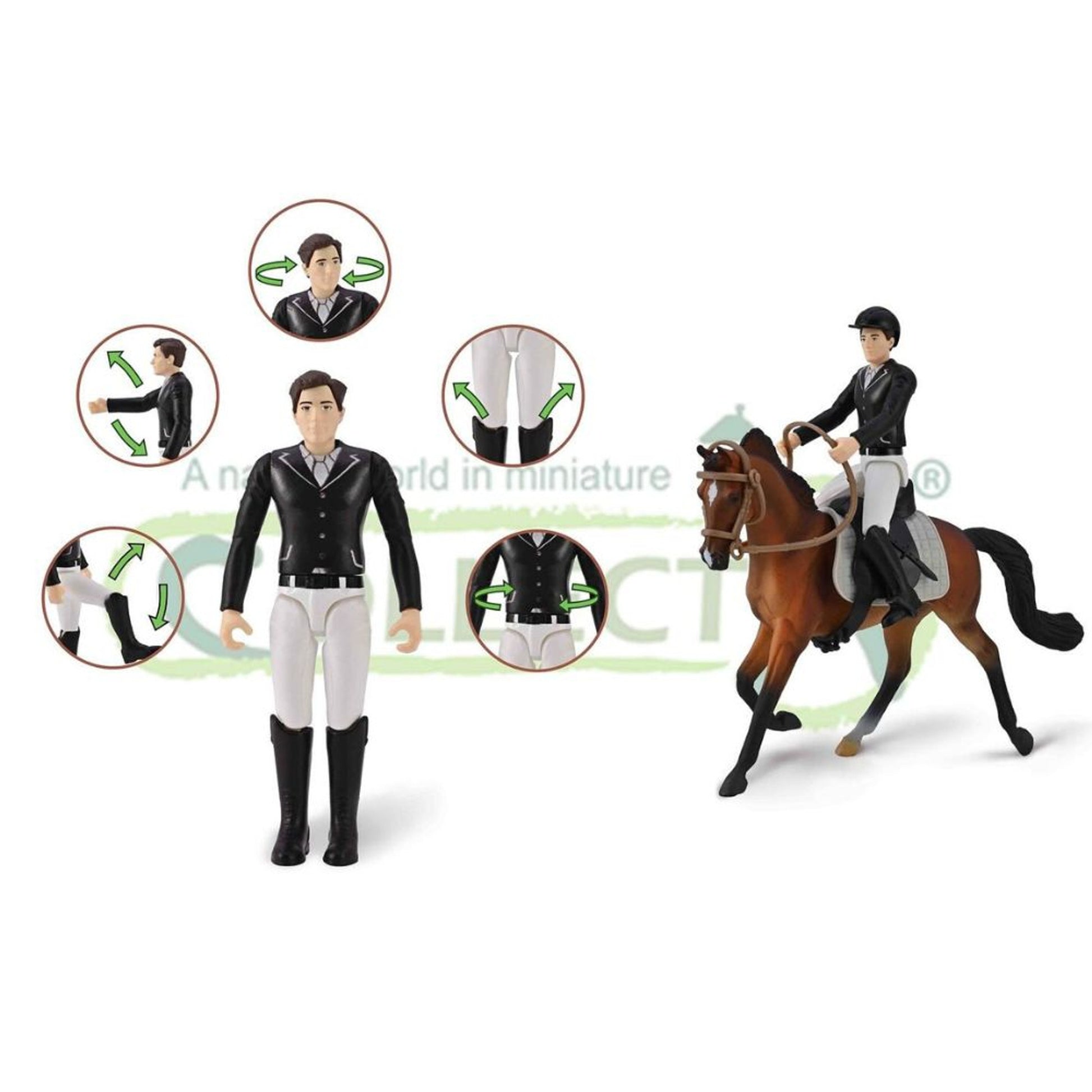Ryttaren bär en avtagbar svart ridhjälm med bred skärm, vilket ger både en autentisk och säker look. Med hjälp av CollectAs sadel (säljs separat) kan ryttaren placeras på valfri hästmodell ur CollectA-serien för en komplett ridupplevelse.