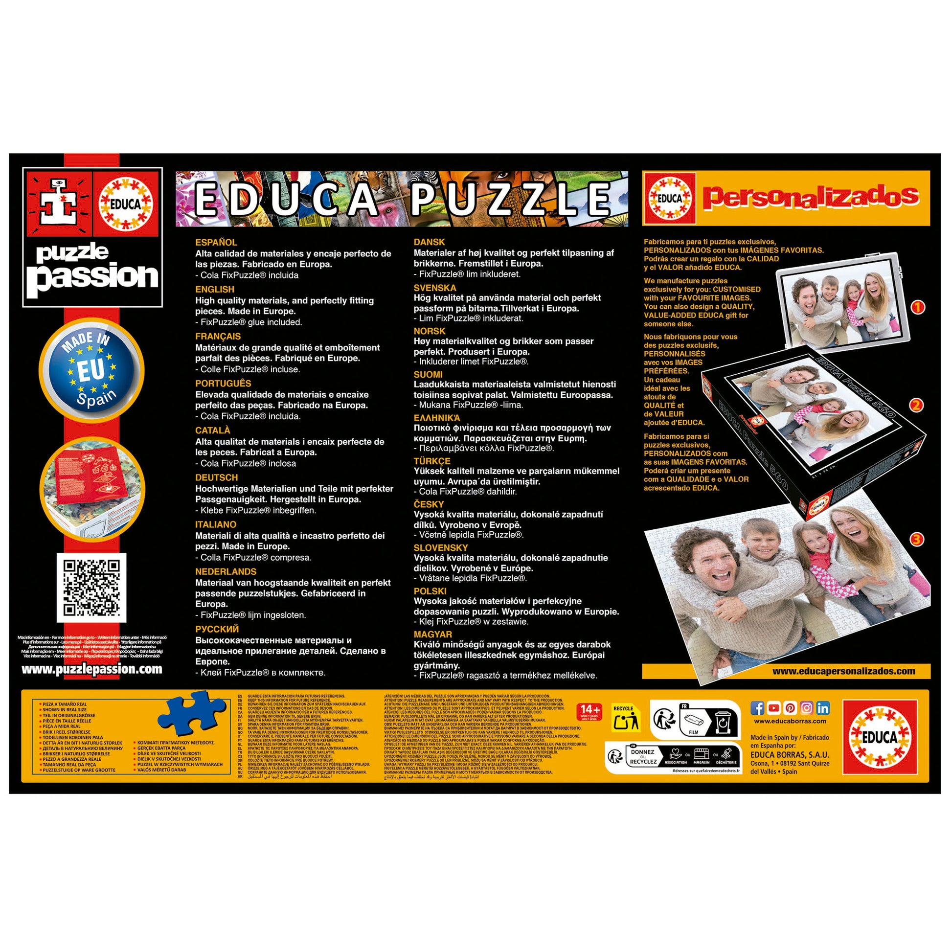 Educa står för hög kvalitet, skarpa färger och perfekt passform. Deras pussel är tillverkade med miljövänliga färger och material av bästa sort. Den glansiga ytan ger ett extra lyft åt motivets livfulla detaljer.