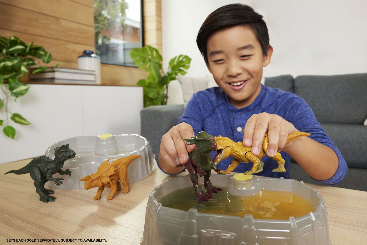 Placera figurerna i den medföljande stridsarenan med varmt vatten och se färgen avslöjas genom en magisk färgförändring. Växtätaren kommer dessutom med realistiska "stridsskador" som du kan "läka" med hjälp av en kall vattensvamp – en rolig interaktiv detalj som gör leken ännu mer spännande!